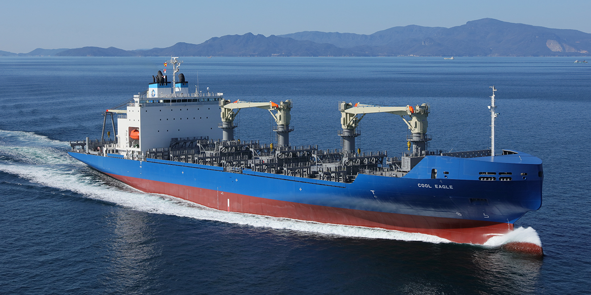 冷凍運搬船は野菜・果実や肉・魚類等を冷蔵あるいは冷凍した状態で運搬する為の船で、当社がReefer Specialistと言われる得意とする船種です。各貨物艙は4層に区画分けされ、冷蔵・冷凍貨物に限らず鉄鋼製品・自動車等の一般貨物の積載が考慮されています。また、上甲板にはコンテナ(冷凍コンテナ含む)積載のための装備があります。